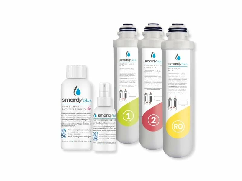 Das Filterset der smardy pure Water Anlage beinhaltet 3 Filter. Dabei handelt es sich um den bereits im Tank eingebauten COMPOSITE MICRO, COMPOSITE ACTIVATED CARBON und der DOW FILMTEC RO Membrane der Anlage. Alle diese Filter sollten in regelmässigen Zeitabständen von 12 Monaten ausgetauscht werden, um zu garantieren, dass die Wasserfilteranlage die volle Filterkapazität besitzt.